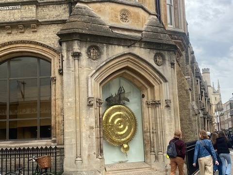 On your way out of the market square, on the exterior of Corpus Christi College, is the popular attraction, the Chronophage. The word chronophage is Latin for ‘time eater’. It was designed by Dr. John C. Taylor to represent the consumption of time. Unveiled in 2009, the piece functions both as an odd eye-catcher and a clock, depicting a mechanical grotesque creature running atop a stainless steel, gold-plated art piece.
